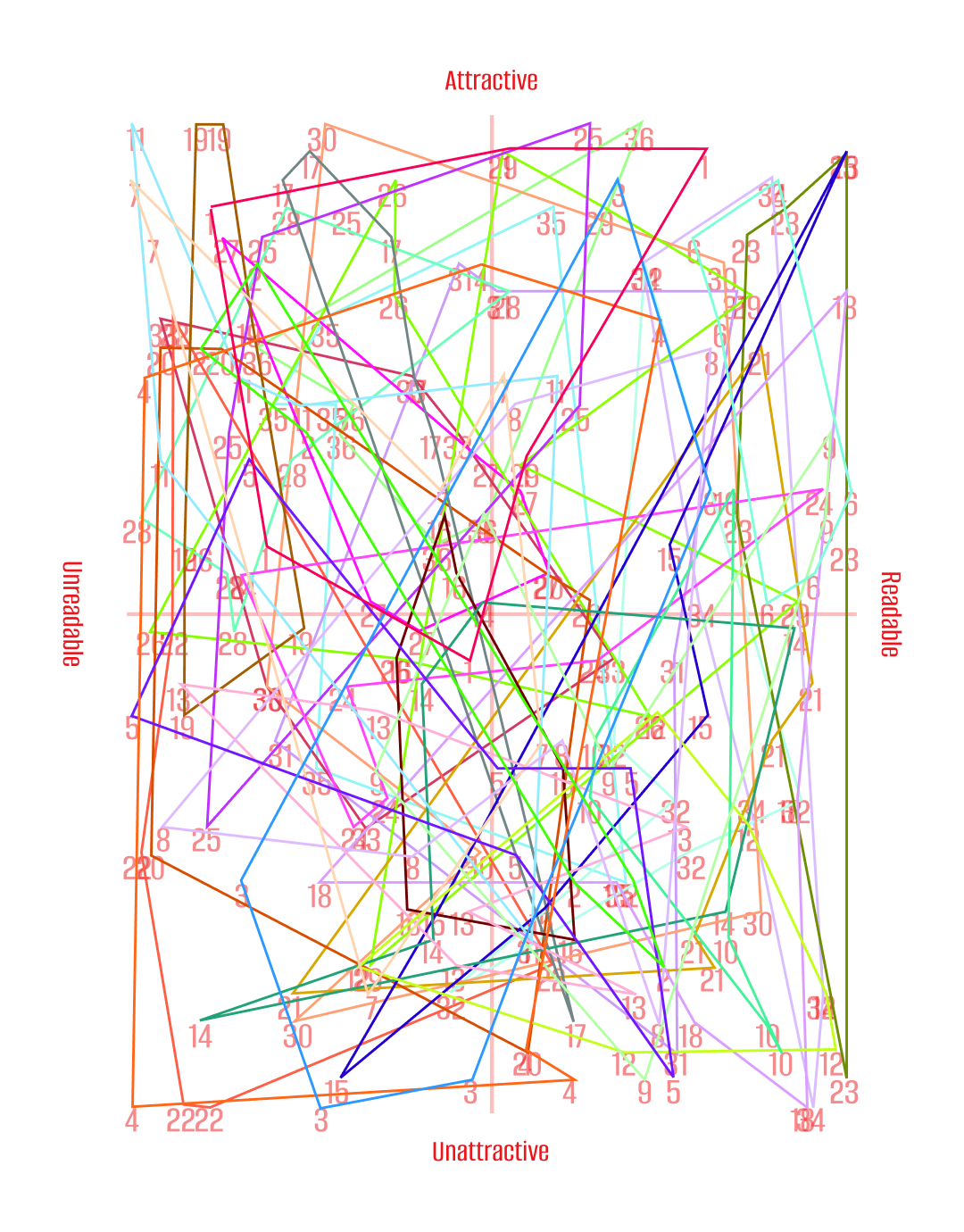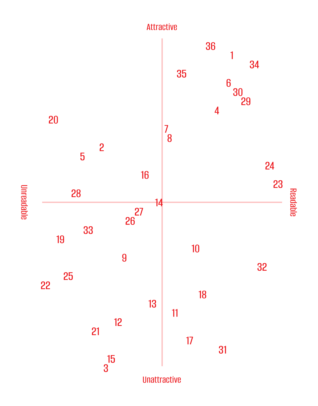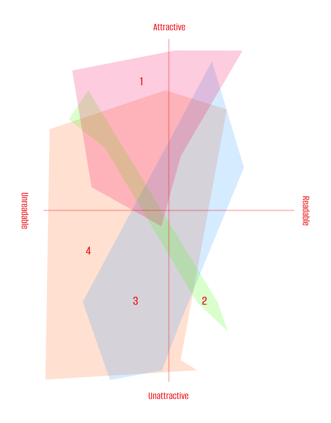 In the last stage of the iteration process, a total of 36 posters have been developed. To get a better understanding of how these posters will be perceived by the broader public, the posters have been evaluated on attractiveness and readability by a total of 6 users. Posters have been shown in different orders for different users to get better results. The results of both metrics of the users then could be incorporated into a coordinate system [1]. The coordinate systems by all users were then fused into one [2], after the results for every number were connected to get final areas [3]. The smaller the area and the more it was located in the top right of the coordinate system, the better it got perceived.